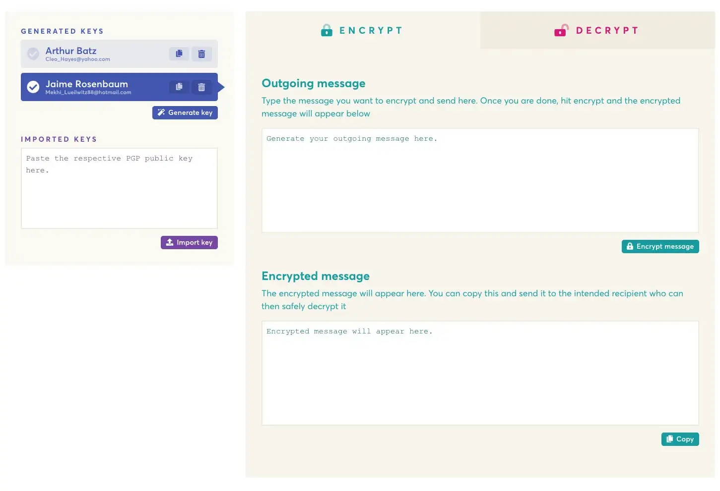 EncryptEasyは、シンプルで使いやすいPGP暗号化ツールで、すべての連絡先の鍵を管理することができます。 暗号化は簡単にできるべきです。 Wailsで開発されました。